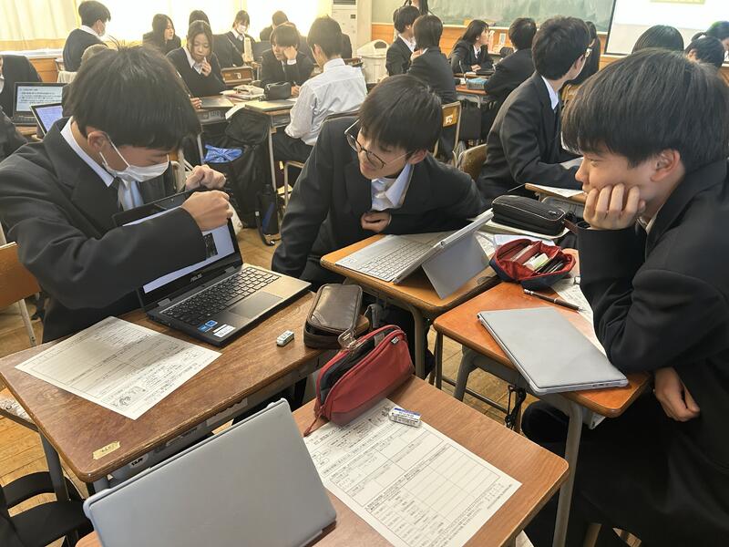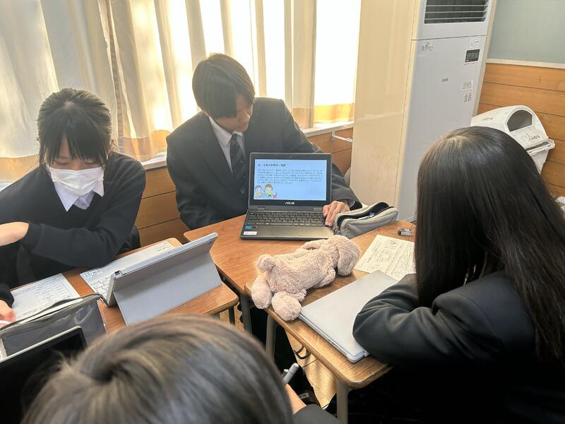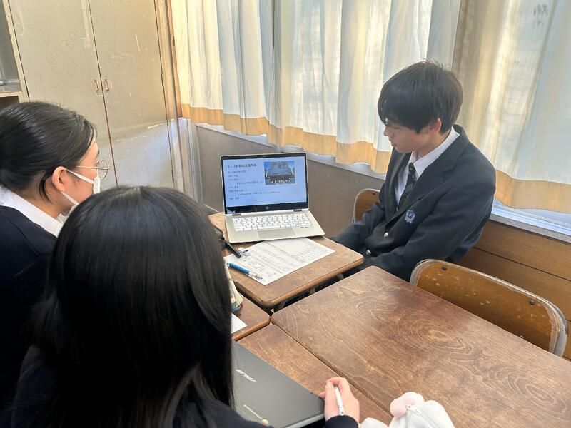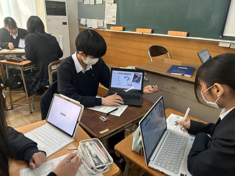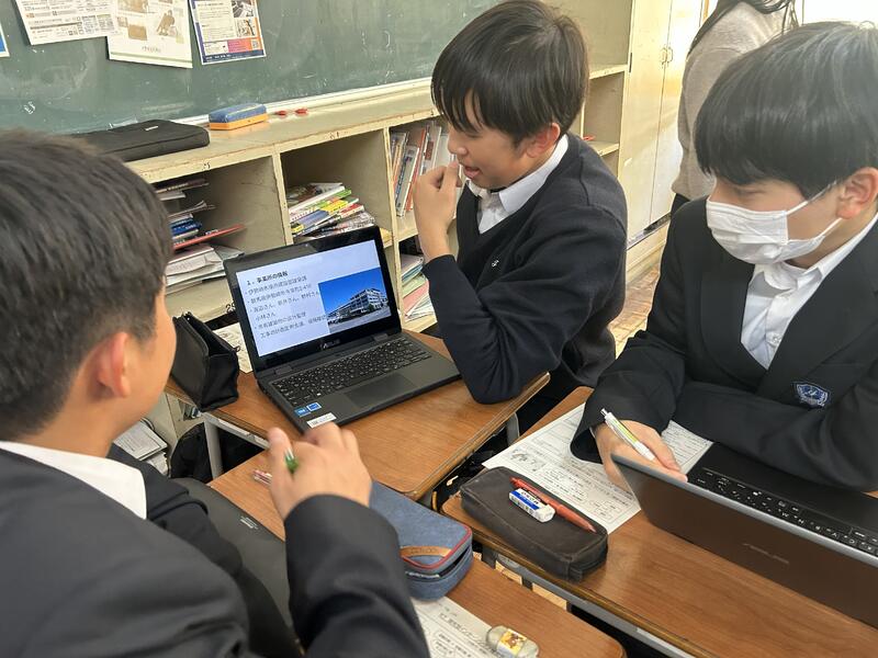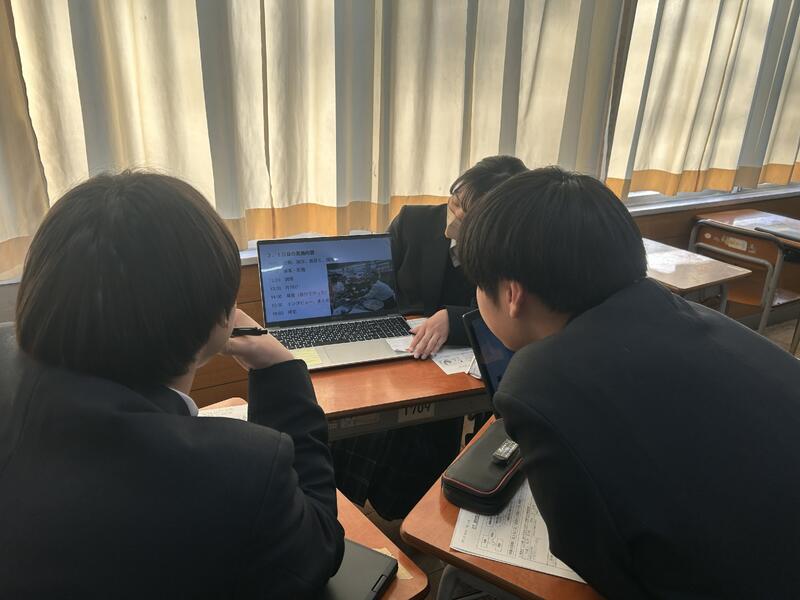 現在、第2学年では、総合的な探究の時間において、班に分かれ、興味のある分野(文化、観光、国際、教育、産業、環境、防災)についての地域の課題を考え、情報収集し分析することで課題解決を図っています。